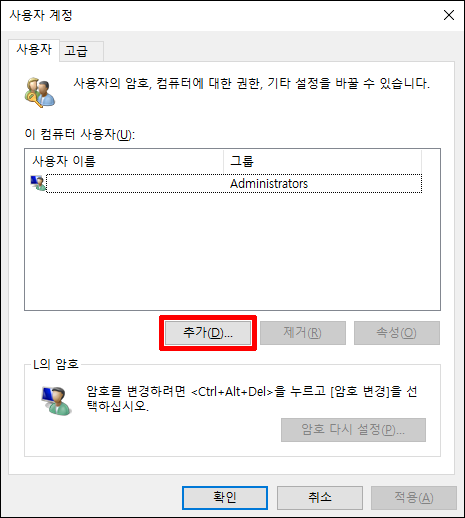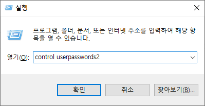 실행창(Windows 키 + R)에서 'control userpasswords2'를 입력하여 사용자 계정 창을 연다.