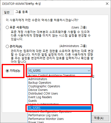 액세스 허용에서 지정한 역할 또는 사용자 그룹을 선택하고 아까 만들었던 사용자 계정의 그룹을 입력한다. 해당 과정을 똑같이 따라왔다면 IIS_IUSRS를 입력하면 된다.