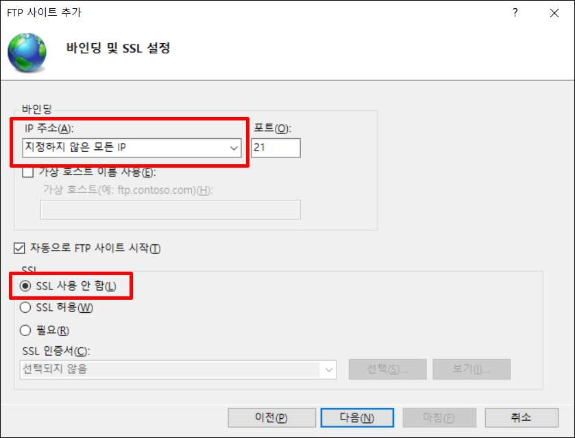 IP 주소는 지정하지 않은 모든 IP로 선택하고 포트는 FTP의 기본 포트 21로 그대로 놔둔다.