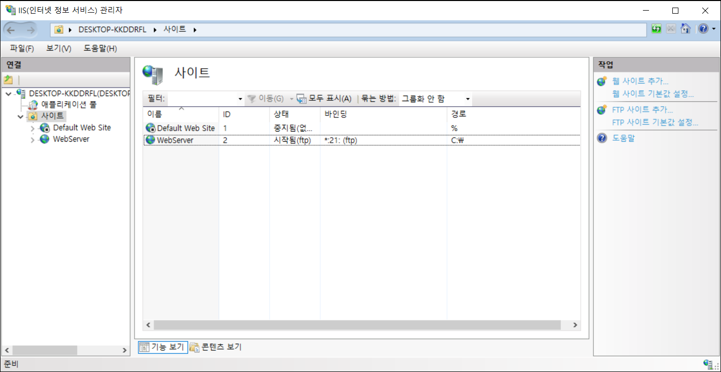 이제 IIS 관리자 창을 열어서 FTP 서버를 만들 차례다.