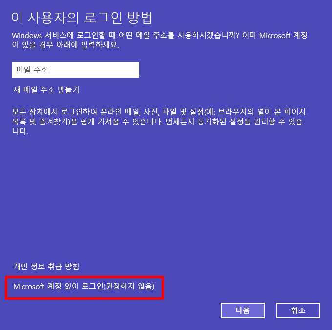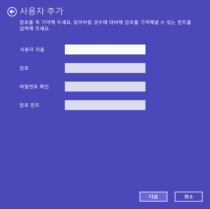 사용자 이름, 암호, 비밀번호 확인, 암호 힌트를 입력하고 다음 클릭