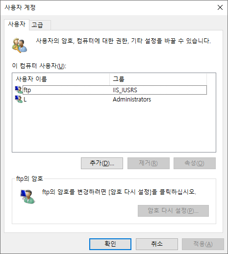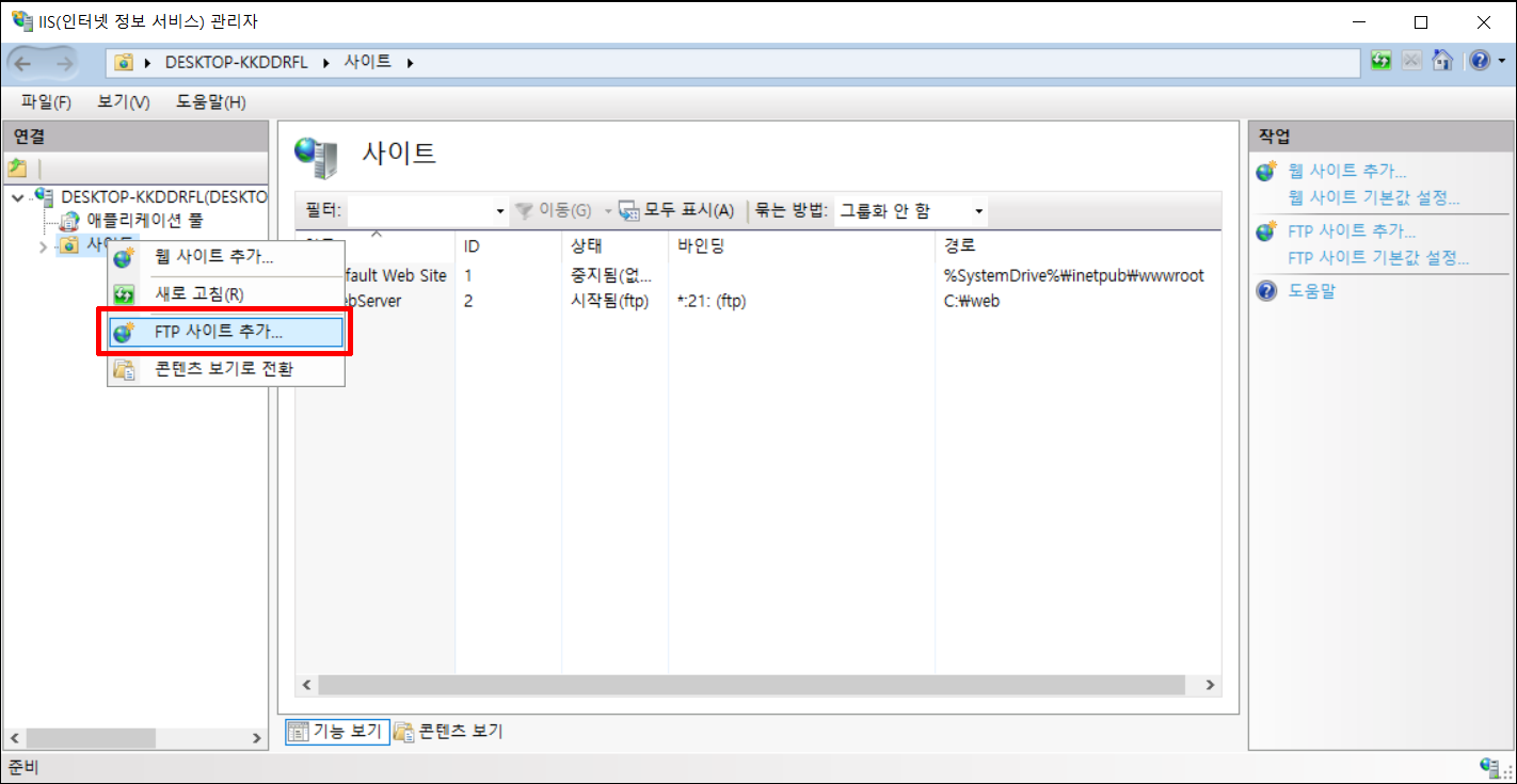 이제 IIS 관리자 창을 열어서 FTP 서버를 만들 차례다.