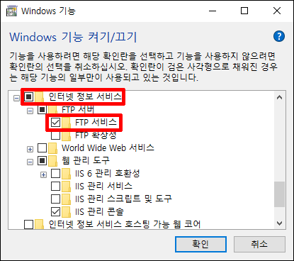 인터넷 정보 서비스 → FTP 서비스 체크 후 확인 클릭