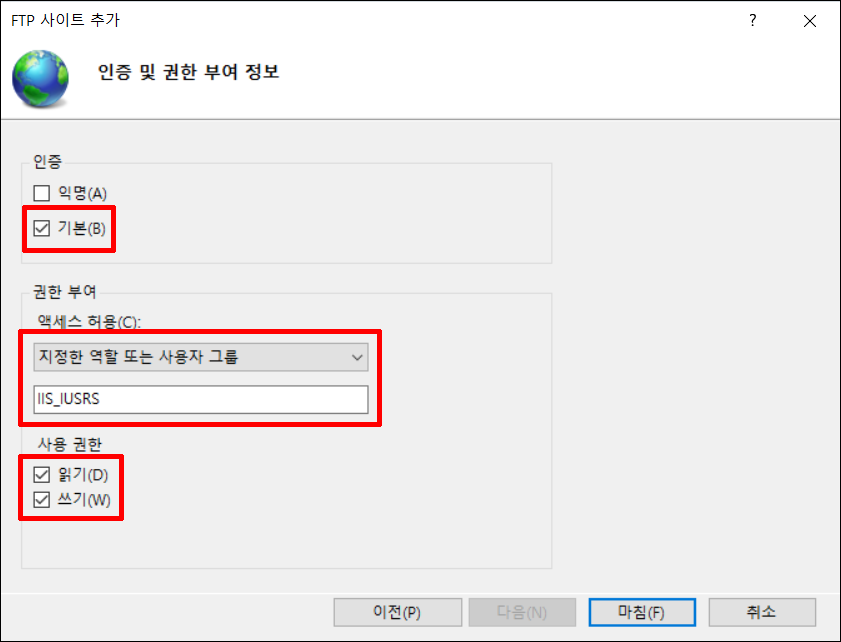 익명을 선택할 경우 로그인 없이 해당 FTP에 접근이 가능해지므로 기본을 선택한다.