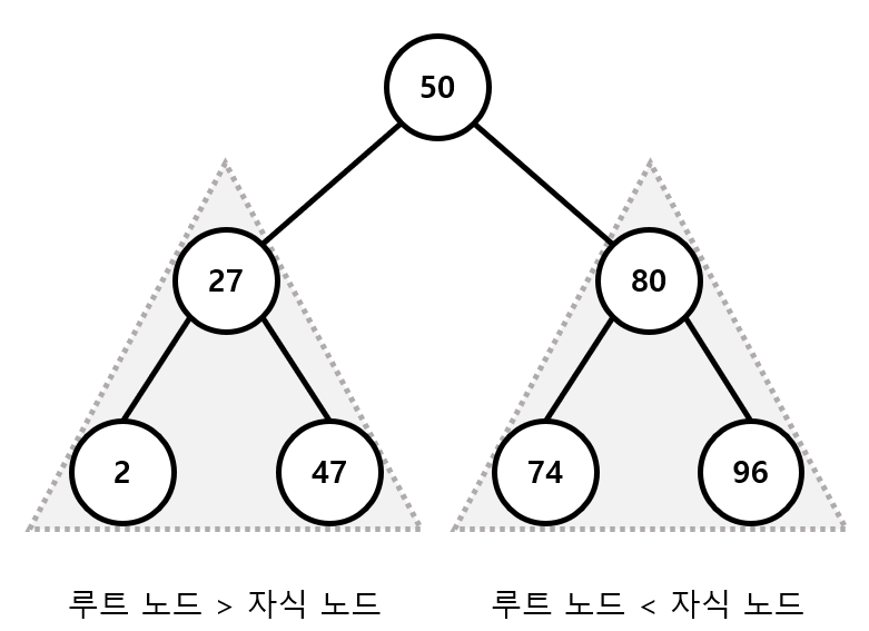 이진트리와 마찬가지로 모든 노드가 최대 두 개의 자식 노드를 가지고 있으며, 부모 노드의 왼쪽에는 부모 노드보다 작은 값의 자식 노드들이, 오른쪽에는 부모 노드보다 큰 값의 자식 노드들이 존재해야 한다.