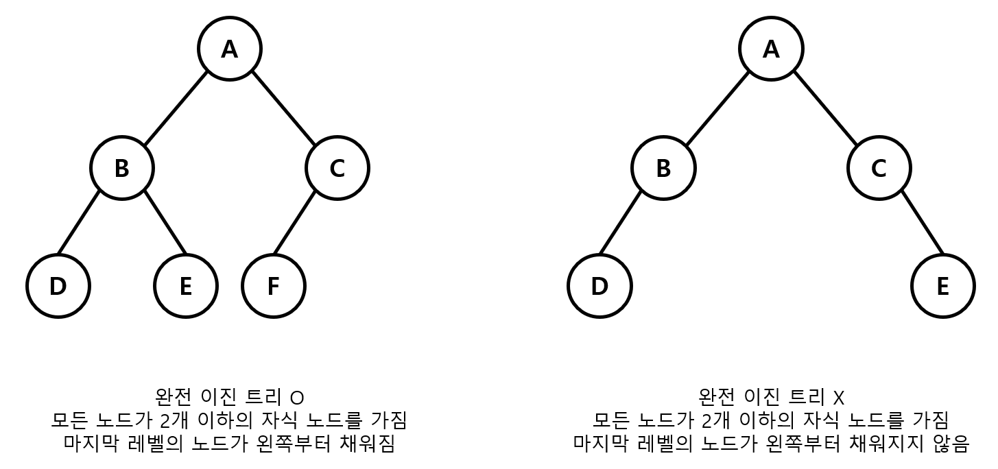 이진 트리와 마찬가지로 모든 노드가 최대 두 개의 자식 노드를 가지고 있으며, 마지막 레벨(최하단)을 제외한 모든 노드는 완전히 채워져 있어야 한다.