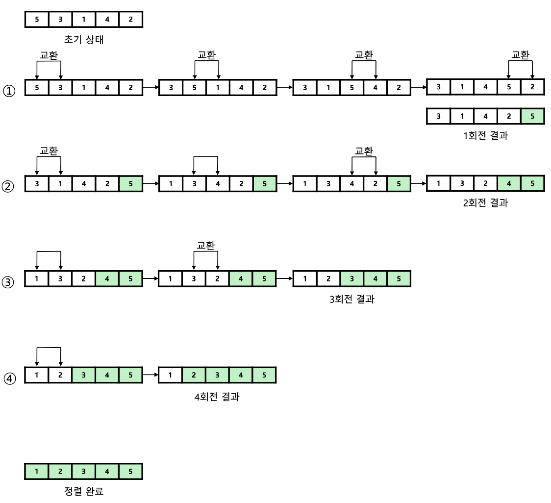 인접한 두 값을 비교해 큰 값을 뒤로 보내 정렬하는 방법이다.