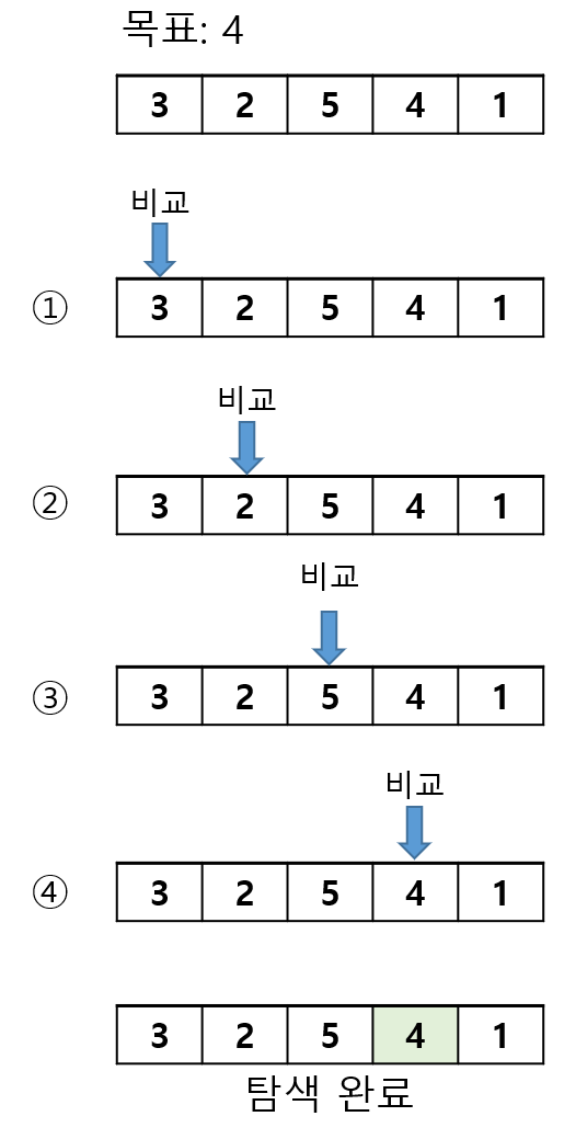 데이터 집합을 처음부터 끝까지 하나씩 비교하면서 데이터를 찾아내는 방법이다.