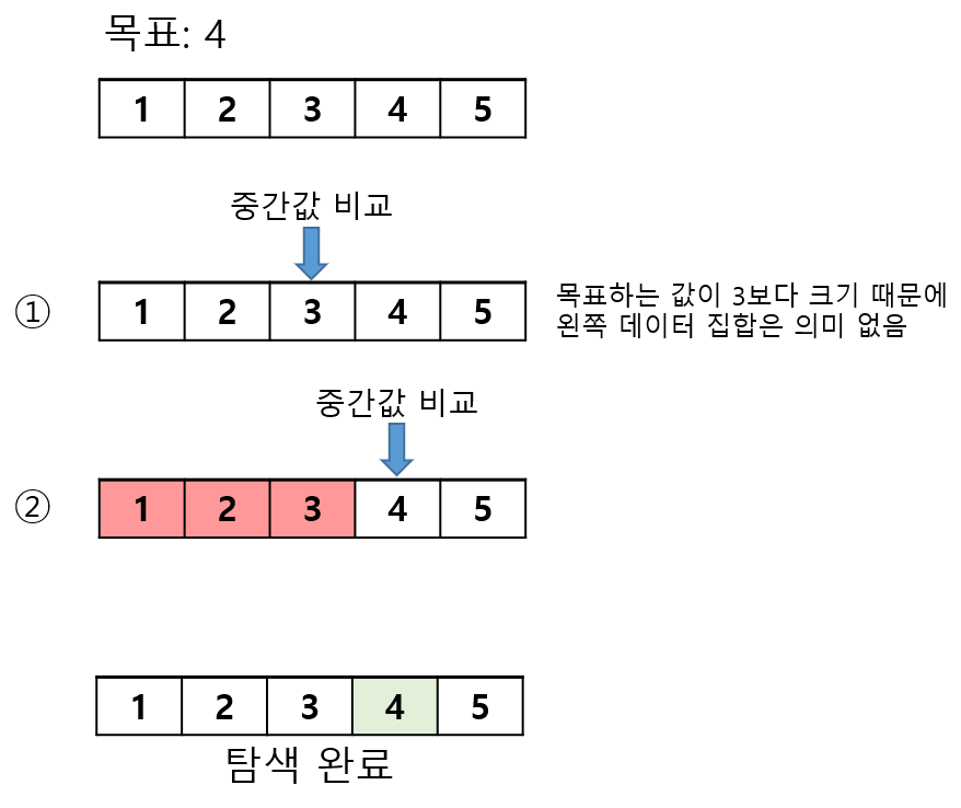정렬된 데이터 집합에서 중간값과 비교하며 탐색 범위를 절반씩 줄여나가며 데이터를 찾아내는 방법이다.